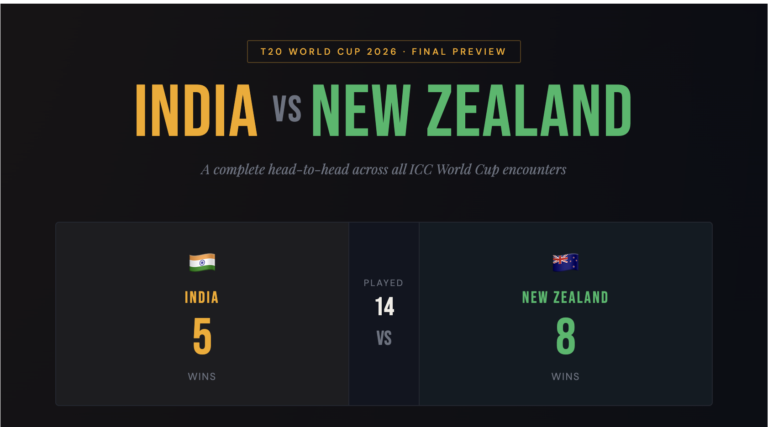 T20 World Cup Record — New Zealand lead 3–0 India have never beaten New Zealand in a T20 World Cup. Here is every match: 2007 — New Zealand won by 10 runs Daniel Vettori’s 4-wicket haul triggered a dramatic India collapse from 76/0. 2016 — New Zealand won by 47 runs India were shockingly bowled…